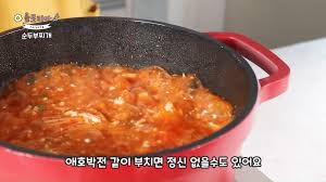 이때 불 조절이 중요합니다. 센 불로 하면 김치가 부서지고, 너무 약하면 고기가 질겨지기 때문에 약한 중불로 유지하는 것이 포인트예요.